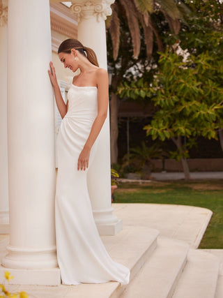 A modern bride, draped in the ethereal elegance of a gown designed by Laura Giurgiu, the visionary behind the House of St. Patrick. Each stitch tells a story of grace and sophistication, with deliberate lines that trace the contours of the female form. Pure fabrics, meticulously chosen, cascade in gentle folds, while studied paneling creates a canvas of timeless beauty. With every step, the bride embodies the essence of minimalist chic and a masterpiece of contemporary craftsmanship and enduring style.