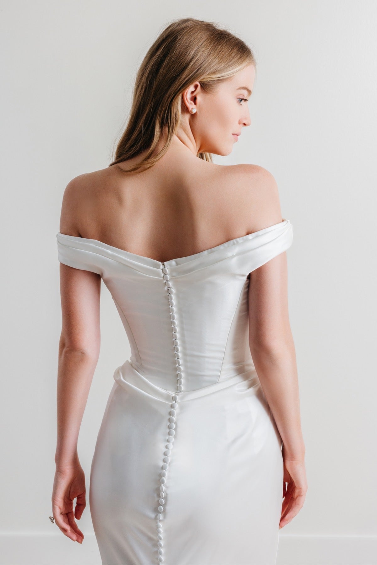 Effortless elegance meets classic glamour in Gisele. Cut from polished satin, this off-the-shoulder sheath features a sleek silhouette, boned bodice, and a row of buttons down the back for that timeless finish. Understated but unforgettable.