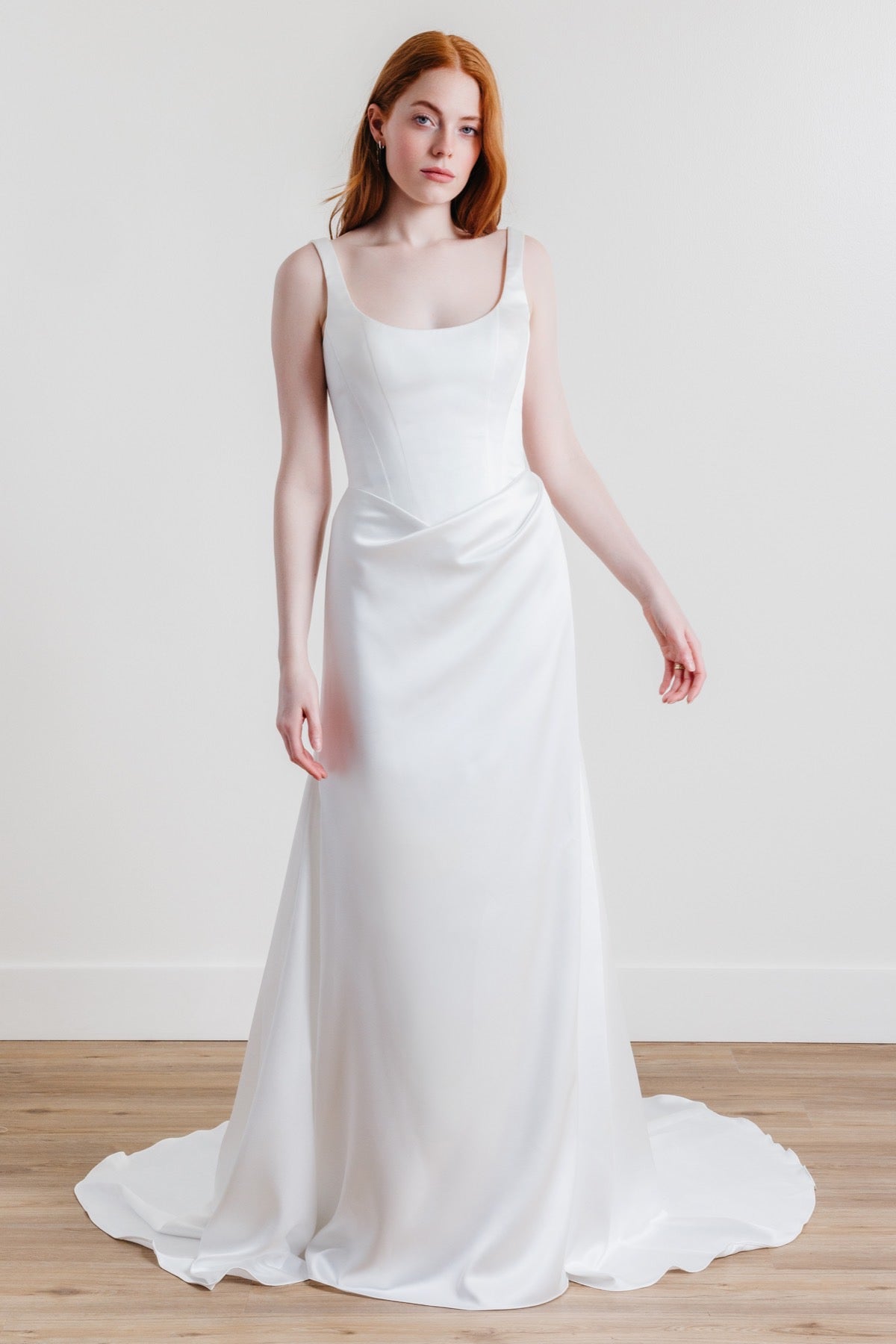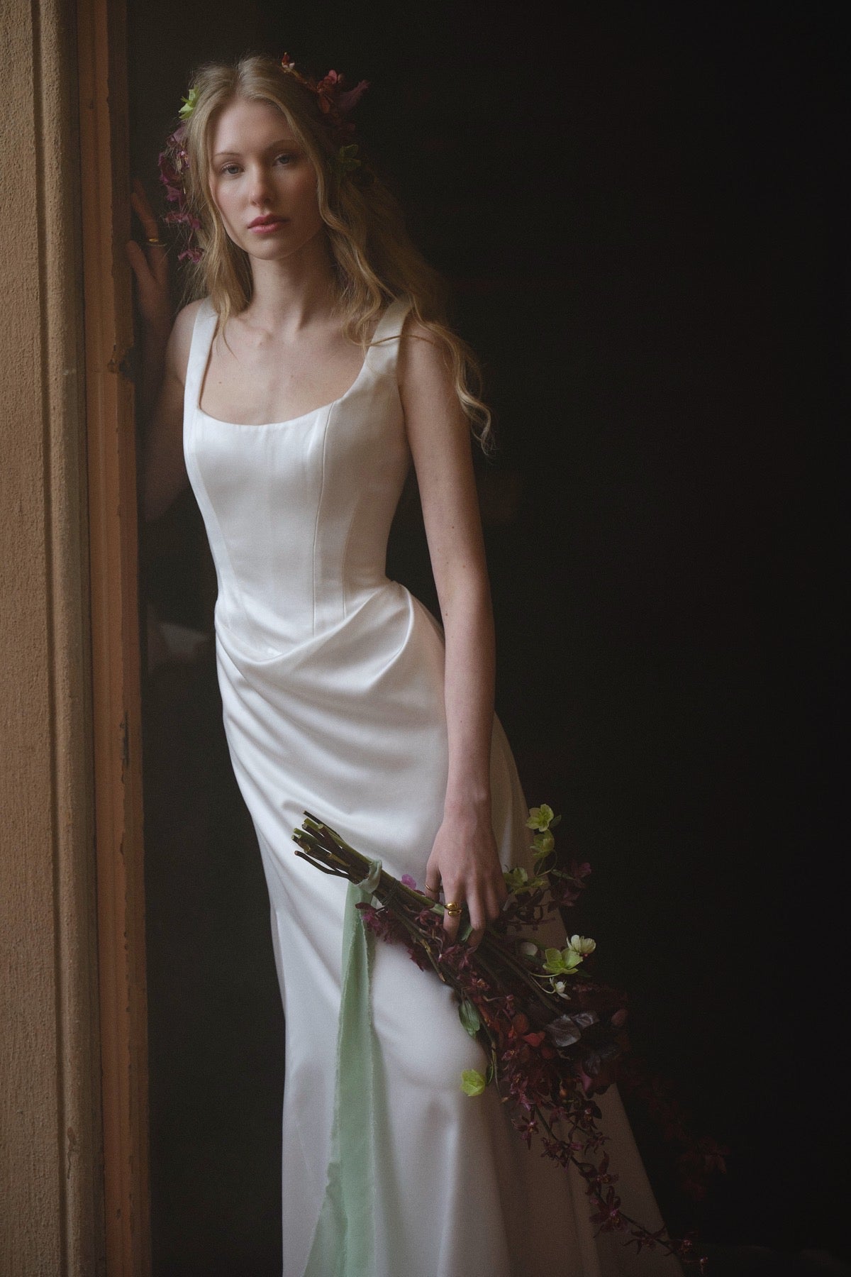 Luna commands the room with sculpted ease. A contoured corset meets soft architectural draping. This gown balances volume and restraint in all the right places, offering a directional silhouette that feels both current and eternal.