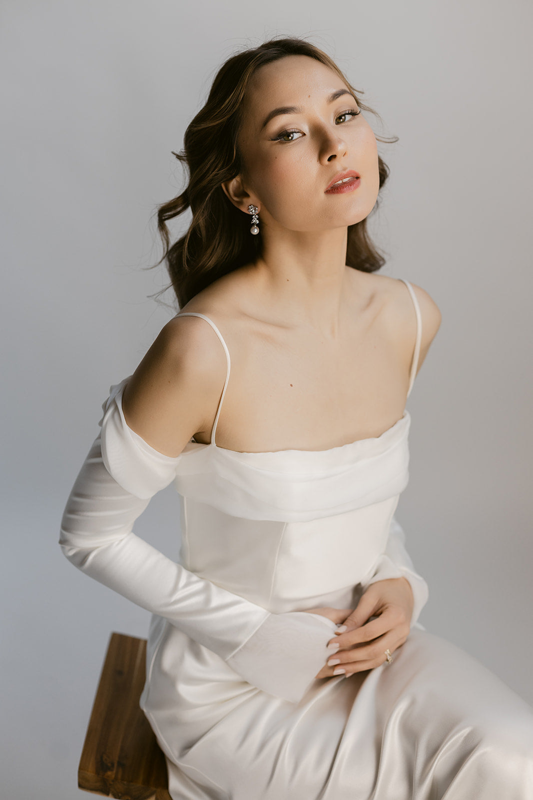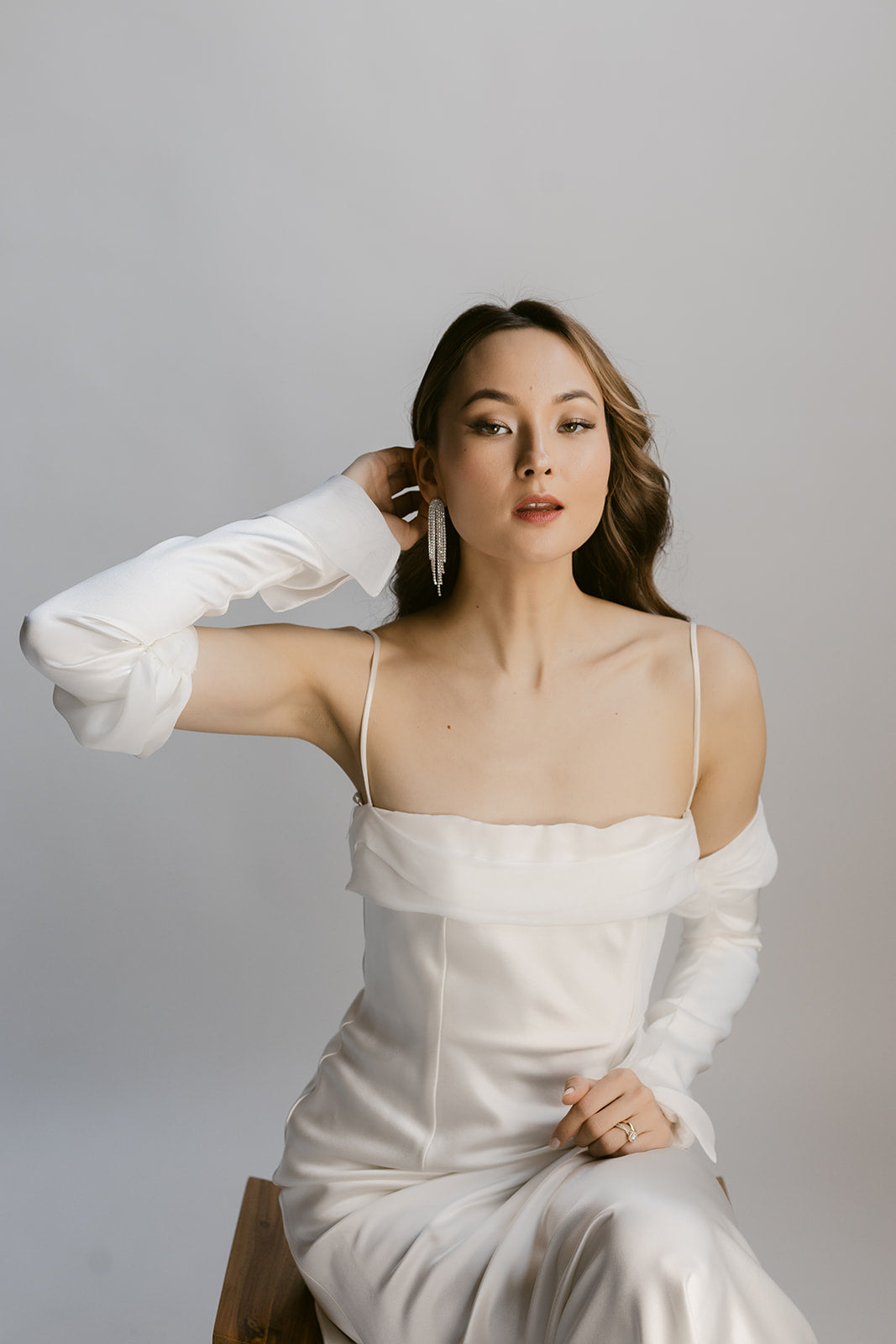A timeless vision of elegance, this long-sleeve sheath gown is crafted from luxurious silk satin crepe, cut on the bias to gently trace the body’s natural curves. A soft, sculpted corset provides subtle structure beneath the flowing silhouette, while the detachable organza train adds movement and versatility to the design.