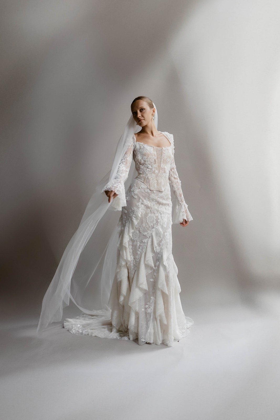 Ethereal and endlessly romantic, the Echo Gown captivates with its intricate layers of lace and soft, sculpted silhouette. Crafted from a harmonious blend of Floral Flutter Motifs, Mika Lace, and Sweet Paisley Chantilly Lace, this gown embodies refined femininity. A structured corset bodice and scoop neckline flatter the figure, while delicate flutter sleeves add movement and grace. The fit-and-flare silhouette skims the body before gently flowing into a sweep train, creating an effortlessly elegant statement from every angle.
