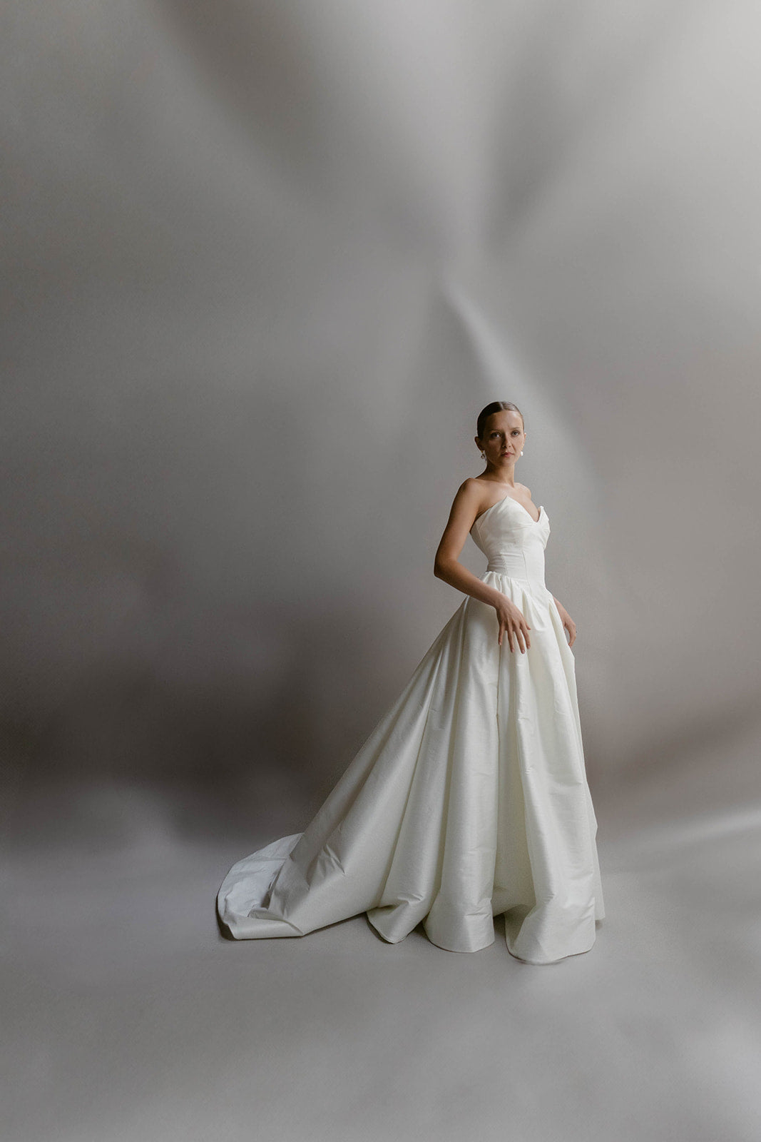 Made of Polished Dupioni, Ember features a corset bodice and a dramatic drop waist skirt. The notched V detail on its sweetheart neckline will flatter your décolletage.