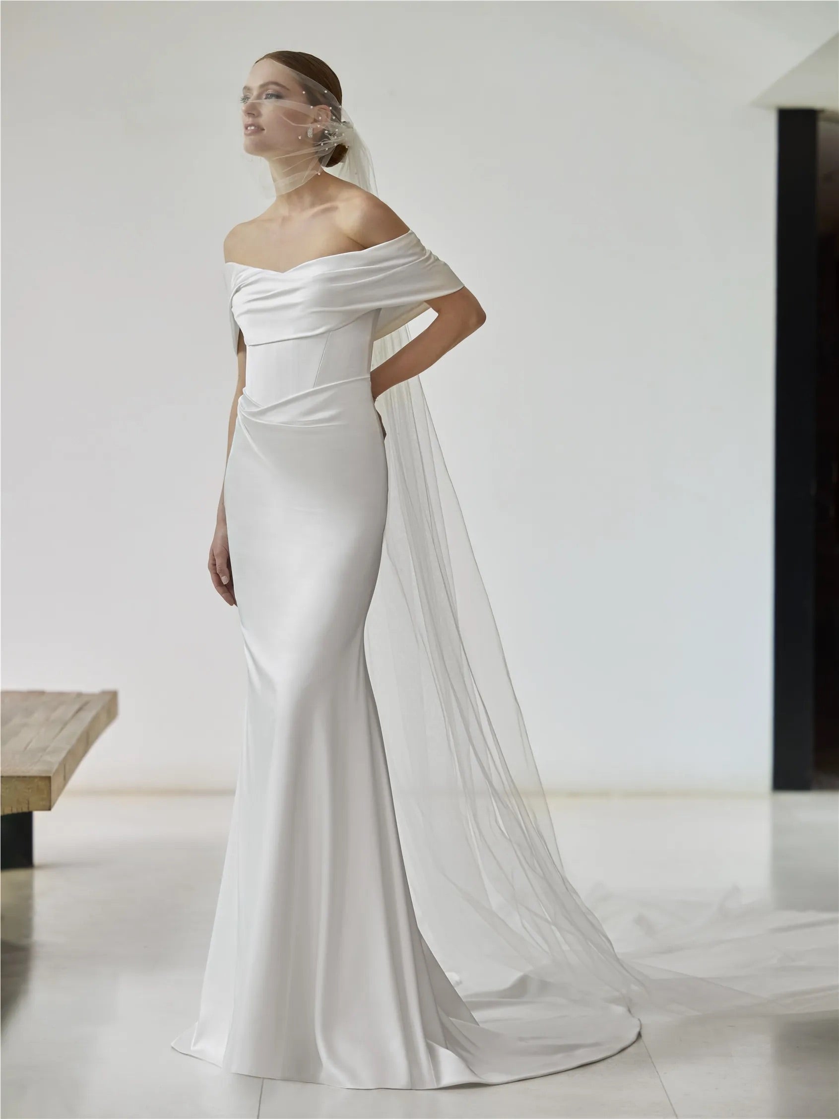 Designed in a sculpting mermaid silhouette, the Leight gown features an off-the-shoulder neckline framed by a softly draped satin. Crafted in fluid satin, the gown catches the light with every movement, creating a clean, luminous line that feels both modern and timeless.